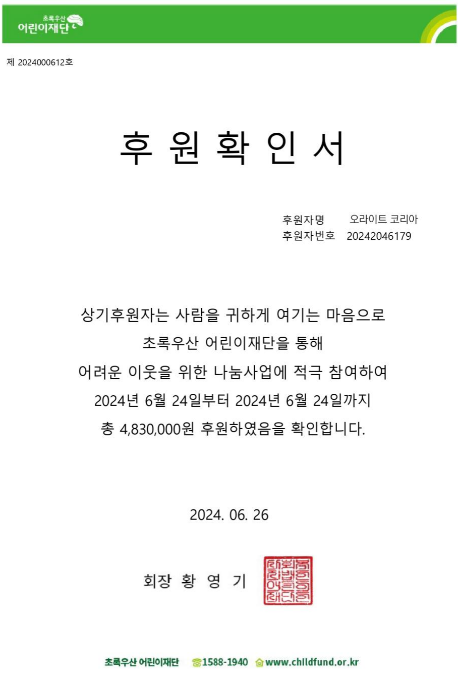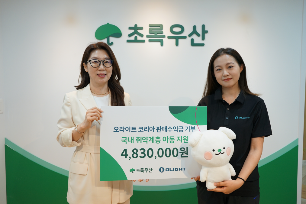 오라이트 회원 여러분의 성원 덕분에 오라이트 코리아 5월 “가정의 달 - 착한 소비” 프로젝트가 성공적으로 진행되었으며, 6월25일 서울시 중구 무교로에 위치한 초록우산 어린이재단에서 판매수익금 전달식을 진행하였습니다.