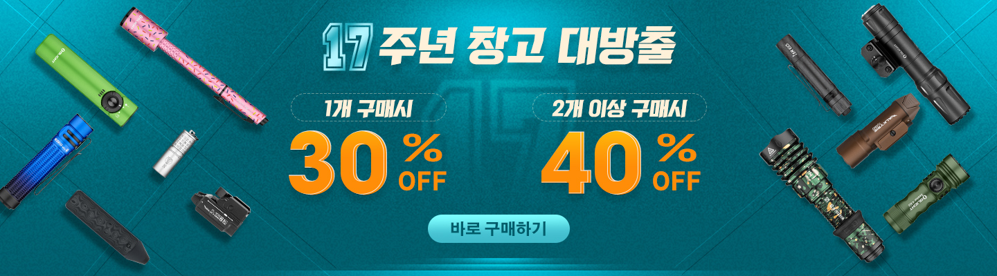 17주년을 맞아 알뜰하고 멋진 쇼핑 경험을 위해 택티컬 라이트의 인기 제품부터 edc 제품, 다용도 툴까지 다양한 품목이 최대 40% 할인을 진행합니다.