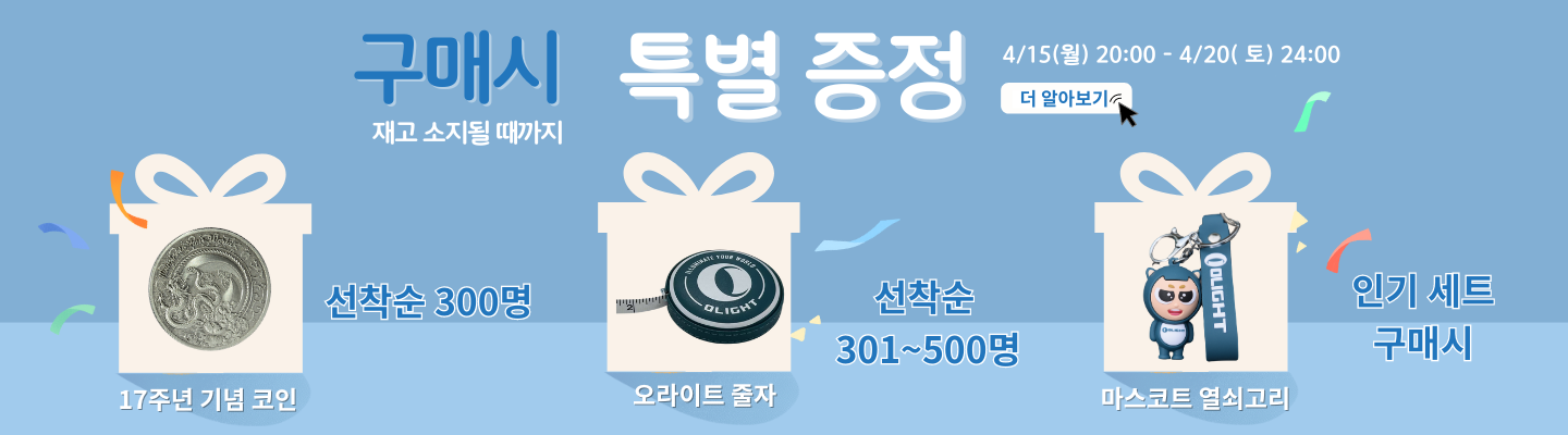 어느덧 꽃이 피고 따뜻한 햇살이 얼굴에 닿는 4월을 맞이했습니다. 17주년을 맞이하는 저희 오라이트는 더욱 벅차오르는 달인 것 같습니다. 이번 4월 및 17주년을 맞이하여 다양한 신제품 출시와 함께 O-FAN 을 위한 이벤트를 총 9개 준비하였습니다.