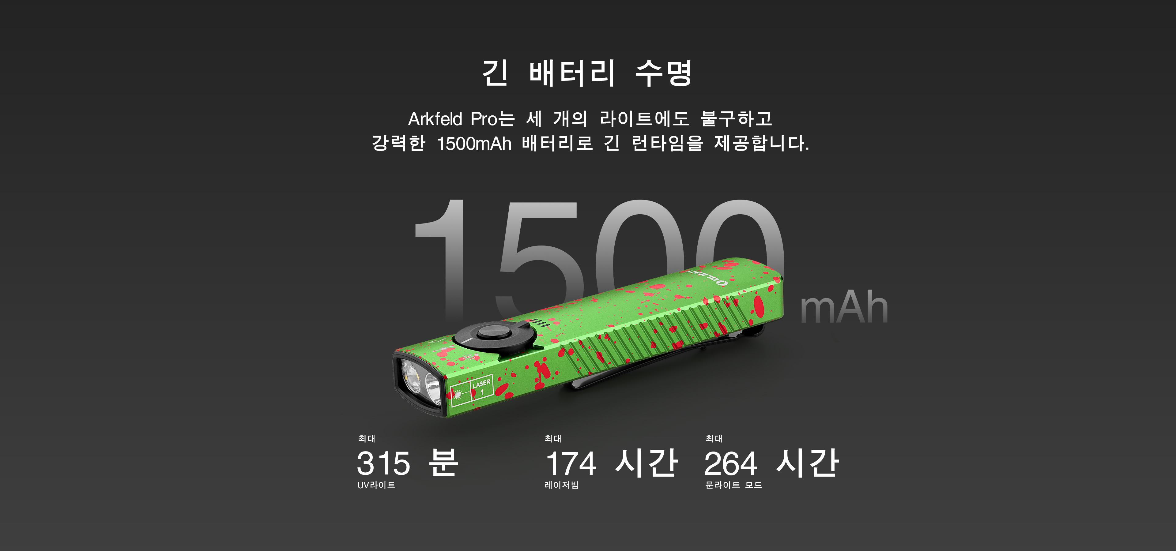 프로 버전은 이전 버전보다 용량이 42.9% 향상되어 1,500mAh의 더 큰 내장 배터리를 가지고 있습니다. UV 라이트는 최대 315분의 런타임을, 레이저는 최대 174시간을, 화이트 라이트는 최대 264시간(문라이트 모드)의 런타임을 제공합니다.