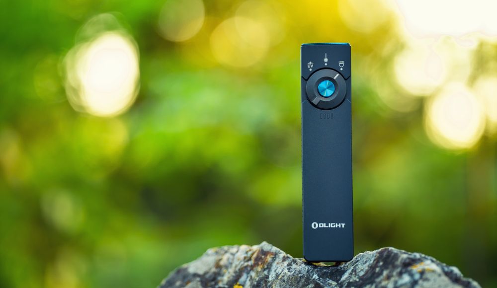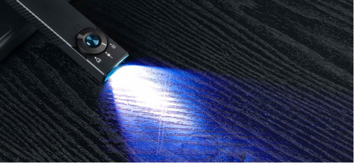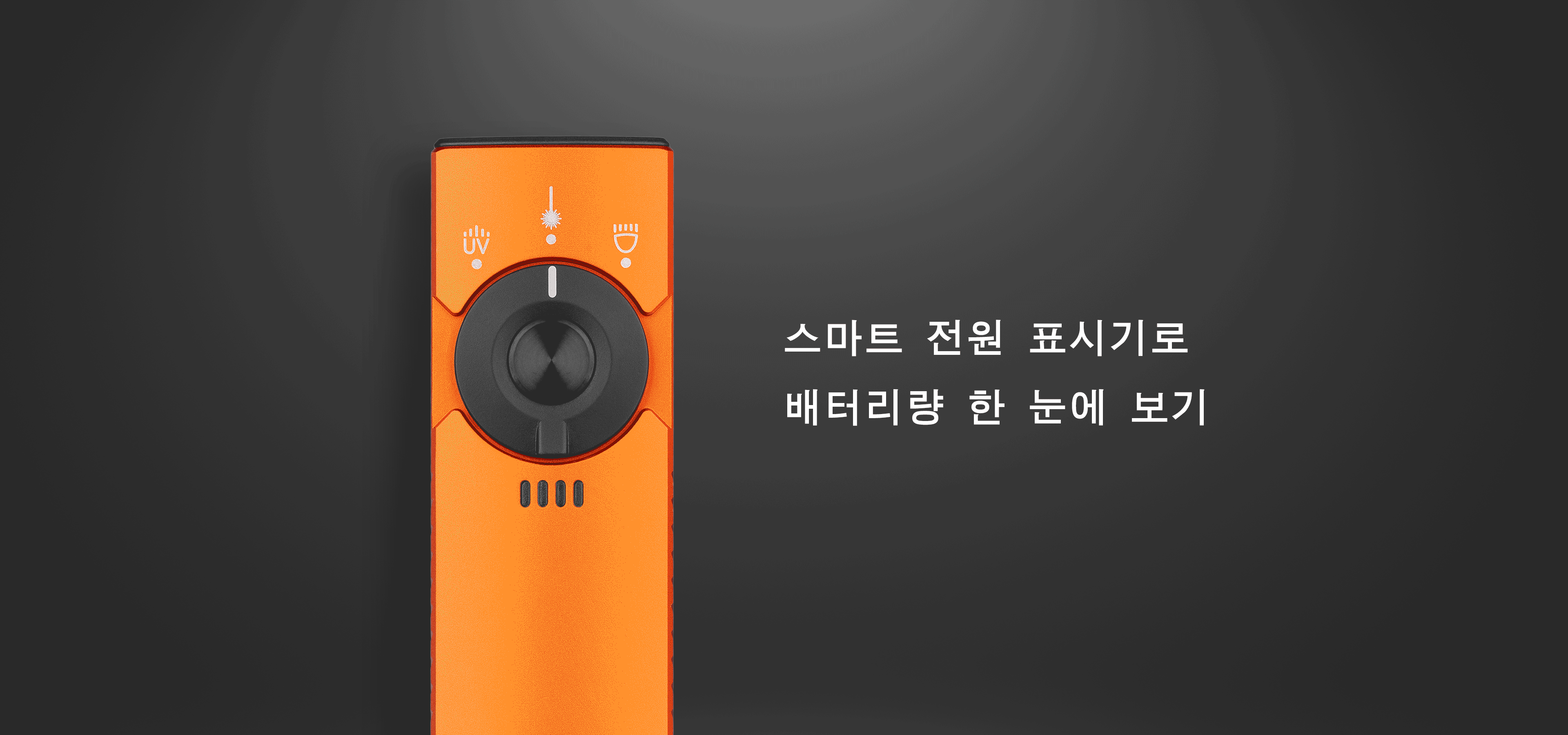 셀렉터를 왼쪽으로 하면 UV 모드가, 가운데 위치시키면 그린 레이저, 오른쪽으로 돌리면 화이트 LED가 켜집니다.중앙 버튼으로 ON/OFF, 밝기 변경, 잠금 등의 기능을 조작할 수 있습니다.