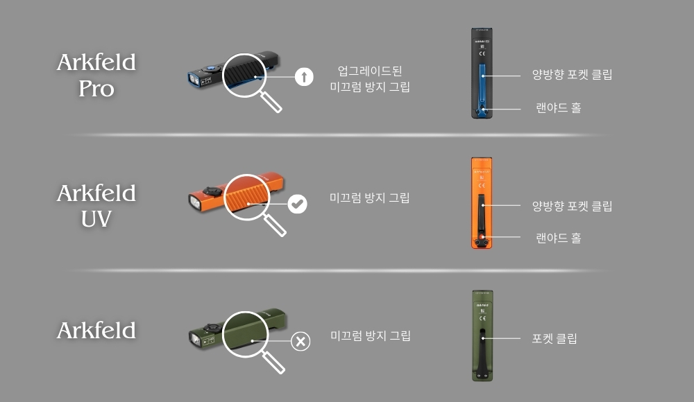 Arkfeld PRO는 화이트 라이트, 그린 레이저, UV 3 가지 모드를 탑재한 오라이트 최초의 휴대용 EDC 라이트입니다. 출시 이후로 많은 팬들의 사랑을 얻은 제품으로 Arkfeld 시리즈의 최종 버전이라고 말해도 과언이 아닐듯 합니다.