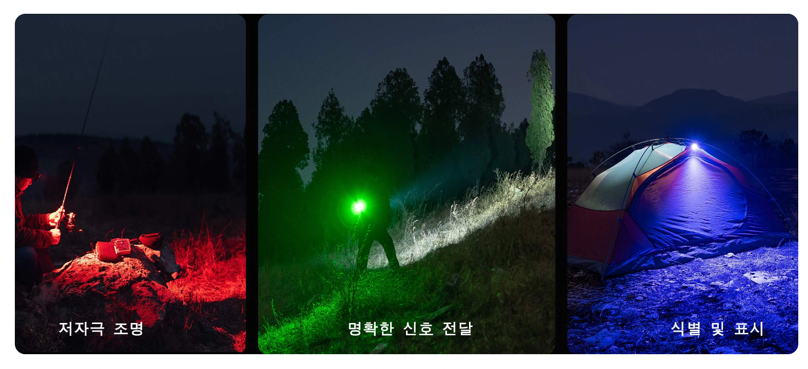 - 그린 모드 (60루멘): 안개 낀 날씨에서 투과율이 높으며, 사냥이나 낚시 시 물고기나 동물을 유인하거나 관찰할 때 활용됩니다.