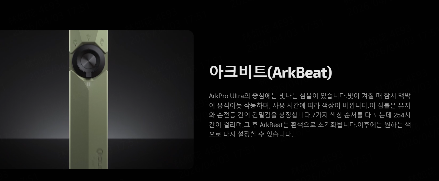 전체 사이클(화이트에서 퍼플까지)이 완료되면 시스템은 자동으로 화이트로 리셋됩니다. 리셋 이후에는 자동 시퀀스에 구애받지 않고 사용자가 원하는 색상을 고정하여 사용할 수도 있습니다. 이를 통해 ArkBeat는 '인텔리전트 타이머'와 '퍼스널 커스텀 도구'의 두 가지 역할을 완벽히 수행합니다.
