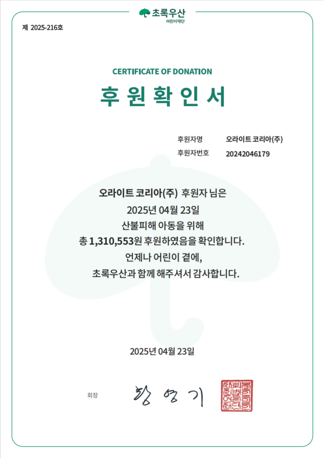 이 기부금은 초록우산 어린이재단을 통해 산불로 일상을 잃은 아이들에게 전달되고 있습니다. 이번 기부는 단순한 자선을 넘어, 일상에서 이루어지는 소비가 어떻게 사회적 가치로 재탄생하는지를 보여주는 살아있는 증거입니다.