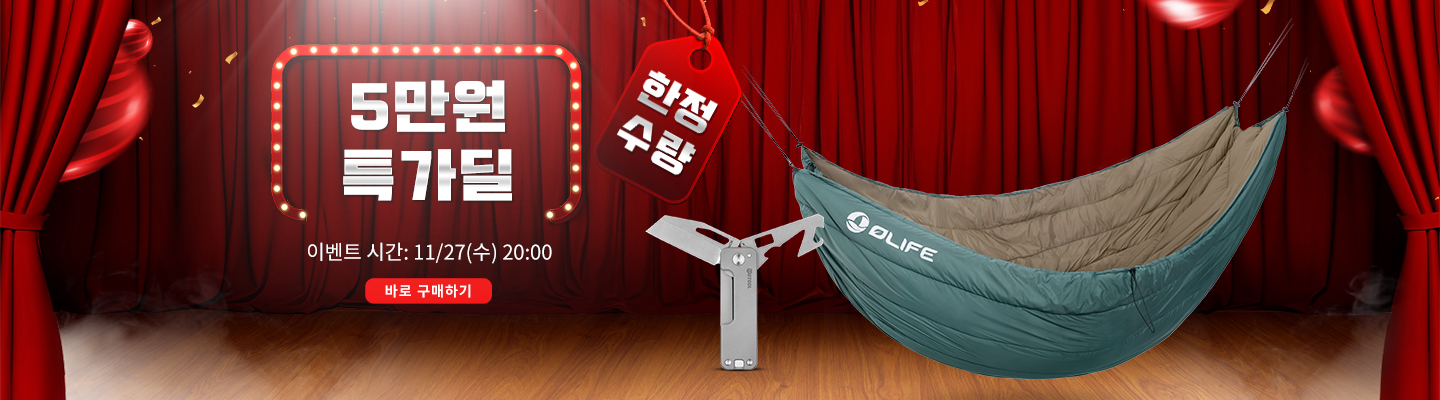 Olight의 아웃도어 브랜드인 OBUY가 출시된 신제품 OLIFE Sunbreeze Hammock Underquilt 해먹과OTOOL 타이타늄 멀티툴 나이프 는 한정 수량에 5만원 특가딜이 11월 27일(수) 20시에 시작할 예정입니다. 많이 기대하세요~