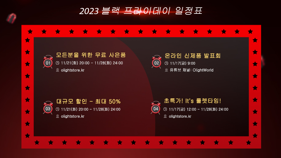 유튜브의 온라인 런칭 이벤트(계정:Olight World)가 있을 예정이니 놓치지말아주세요. 여러분이 궁금해하는 2023년 블랙 프라이데이의 신제품 정보가 발표될 예정입니다.
